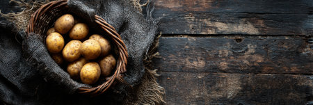 Earthy basket brimming with various potatoes sits on a weathered dark wood tabletop, showcasing a rustic and natural presentation of harvest time.