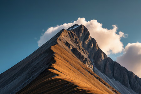 As the day begins or ends, the last rays of golden sunlight kiss the rugged summit of a majestic mountain.