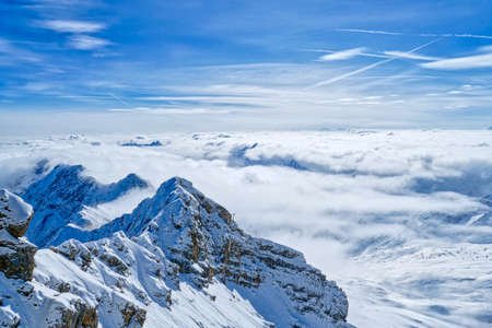 View from the Zugspitze at the mountains of the Alps in the clouds