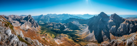 Experience the breathtaking beauty of rocky mountain peaks rising majestically above a lush green valley under a clear blue sky with soft, fluffy clouds.
