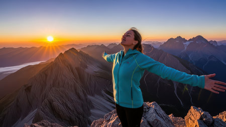 Woman enjoying serene mountain sunrise with arms outstretched.