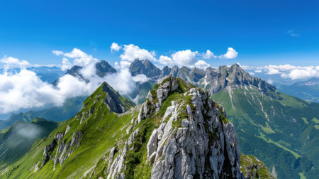 Beautiful top of mountain surrounded by clouds. Generative AI