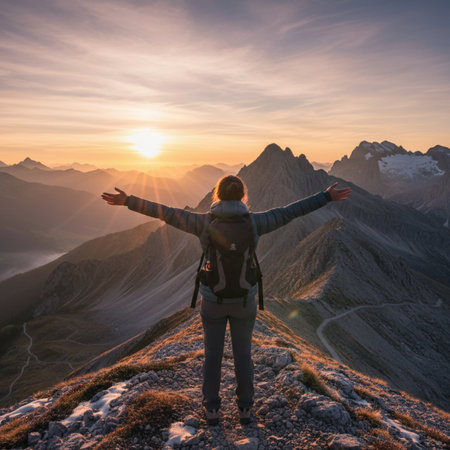 A breathtaking mountain landscape with snow-capped peaks, green valleys, and a hiker standing at the summit with arms raised in