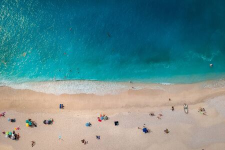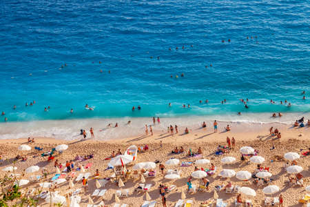 Kas, Turkey - 08.25.2021: People Crowd Relaxing On Beach. Swimming people in sea. Top view of Kaputas Beach between Kas and Kalkan. The best beach in Turkey with turquoise waters, Mediterranean Sea