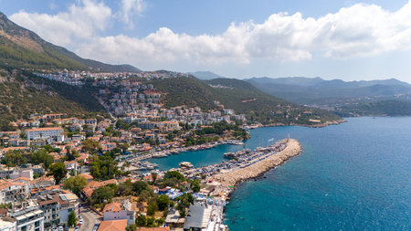 Aerial view of Kas coastal town in Turkey with marina, harbor, boats, mountains and blue Mediterranean Sea on a sunny day. Travel and tourism concept.