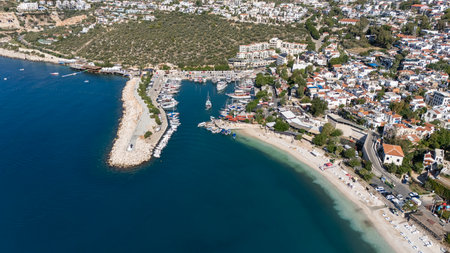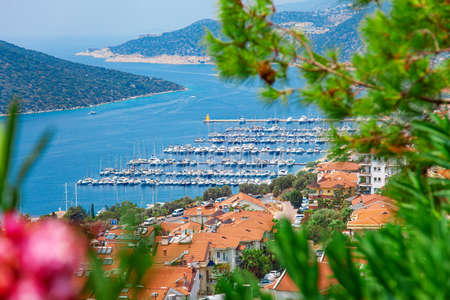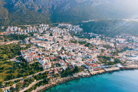 Panoramic top view of seaside resort city of Kas in Turkey. Summer holiday, tourism and vacation.