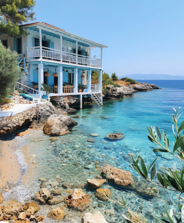 Summer time in Greece. Beautiful Greek coastline next to sea shore during warm weather.