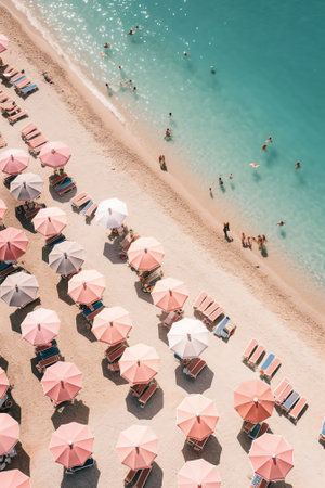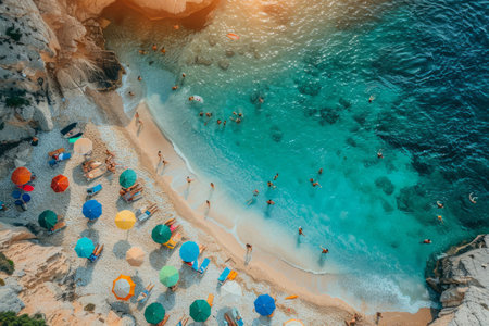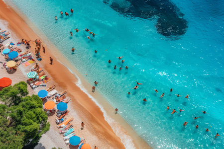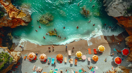 Aerial view of colorful beach umbrellas and swimmers in the turquoise sea. Bright and vibrant photograph on a sandy beach background. Concept of summer vacation.