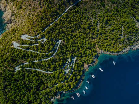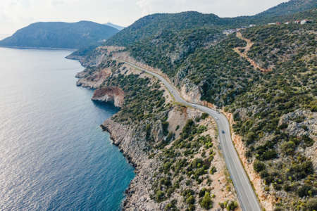 Aerial view of curves coastline road alonge sea. Summer time road trip to sea by car on coast Highway