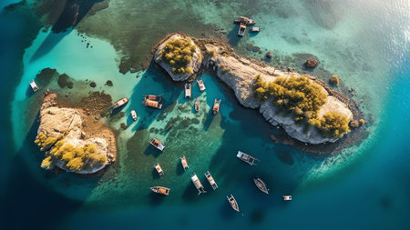 An overhead perspective capturing the expanse of a large body of water surrounded by land, An overhead capture of clear emerald sea with a rocky shore, AI Generated