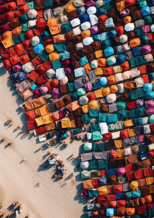 Generative AI : Narayanganj Bangladesh 05 November 2022 Aerial view of people working in an open air laundry with colourful fabric hanged to dry