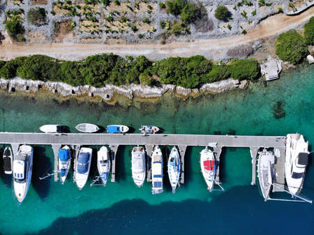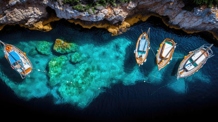 Aerial view of floating boats moored on a transparent sea. Relax on the Ionian Sea. Bathers. Corfu island, Limni beach Glyko. Greece