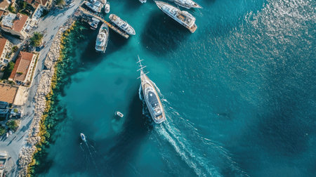 An aerial image of a yacht sailing alongside a busy harbor, with other boats and ships in the background, showcasing the vibrant life of coastal towns and their maritime activities.