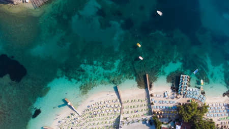 Aerial view of boats in mediterranean sea in Oludeniz,Turkey. Beautiful summer seascape with boats, clear azure water and sandy beach in sunny day. Top view of yachts from drone. Nature background