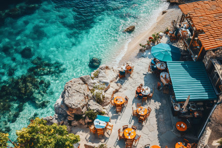 People enjoying lunch at a traditional Greek restaurant by the turquoise sea on a sunny summer day