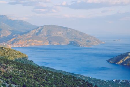 Vintage seascape and coastal nature background. Blue sea and mountains in the morning as art print