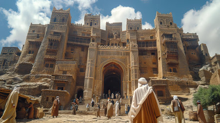 A captivating desert landscape featuring an ancient fortress along a winding road, showcasing natural beauty in a sunlit, serene environment.
