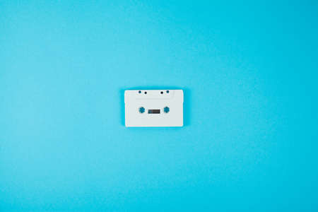 top view of vintage audio cassette tape blue background