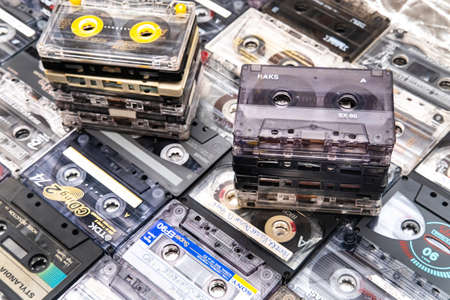 March 28,2021, Minsk, Belarus.A huge collection of audio cassettes. Retro music background.