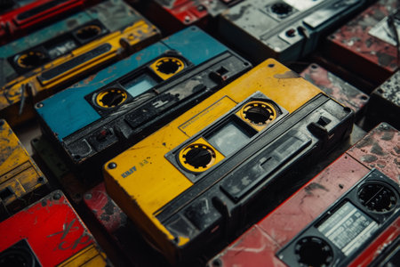 Retro cassette tapes in an array of vivid hues. Top view. Background. Concept of vintage music, collectible items, the 80s and 90s culture, and the charm of physical media. Banner
