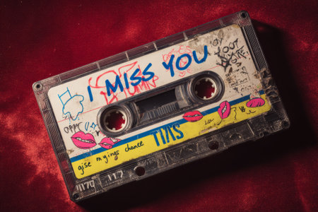 Retro audio cassette tape with romantic messages and drawings, evoking nostalgia and memories of past relationships