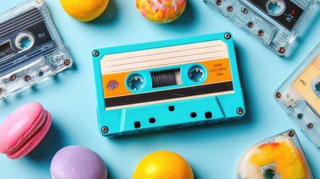 A vibrant retro cassette tape surrounded by colorful sweets and treats. This playful arrangement captures the essence of nostalgia and joy for music lovers.