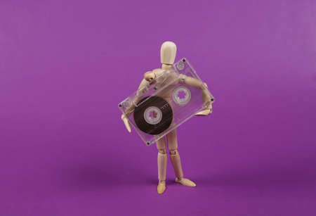 Wooden puppet holds audio cassette on purple background.