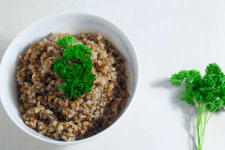 Vegan buckwheat porridge topped with fresh parsley in a bowl on a white table. Healthy breakfast