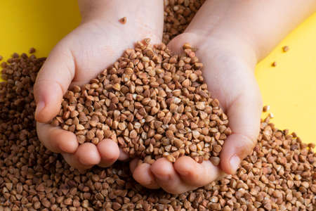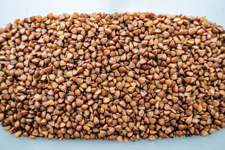 Buckwheat grain dry buckwheat. Close-up of brown buckwheat groats. Healthy food.