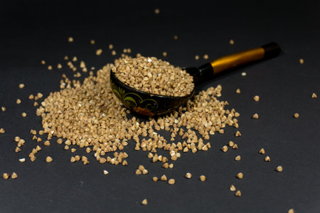 Raw brown buckwheat lies in a Khokhloma spoon and grains are scattered around