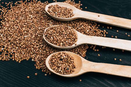 Buckwheat groats in a wooden spoon. Healthy eating concept. Vegan diet. Selective focus. for background and screen saver