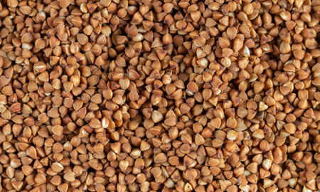 Closeup of buckwheat kernels, Detailed view of rustic buckwheat groats, Highresolution image showcasing buckwheat kernels with warm earthy tones and detailed granularity