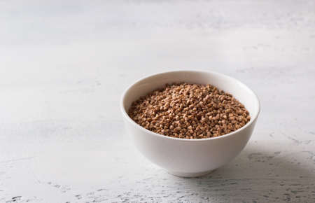 Raw buckwheat in a white ceramic bowl on a light gray textured background, horizontal, space