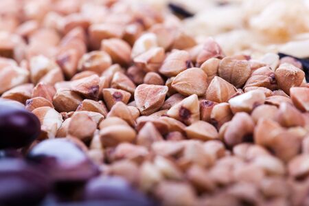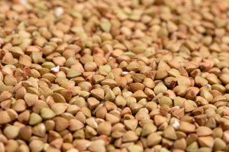 Macro photo of buckwheat groats. Many small objects close up. Healthly food