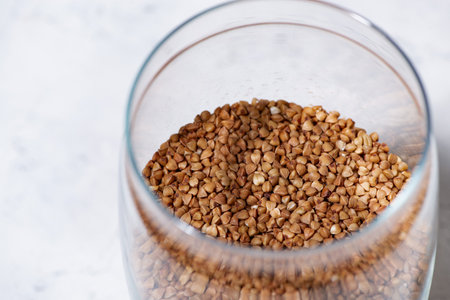 Buckwheat in a glass jar on a wooden white table. Copy, empty space for text.