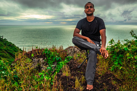 man sitting at mountain cliff enjoying the breathtaking view of sea horizon at morning image is taken at gokarna karnataka india.