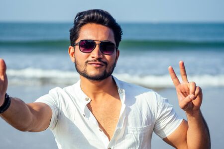 handsome and young indian male model beard and black hair haircut,fashion earring and glasses on a background of tropical ocean.selfie portrait man businessman student relaxing on the beach sea