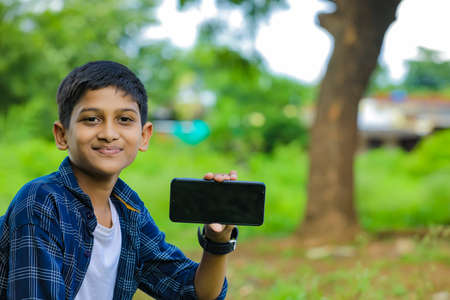 Indian / Asian Little boy studying online using mobile phone at home