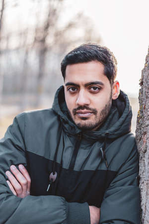 Portrait of beautiful young stylish man looking a camera and sitting near a tree in winter season