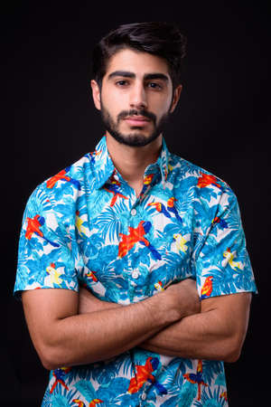 Young handsome bearded Persian tourist man ready for vacation against black background