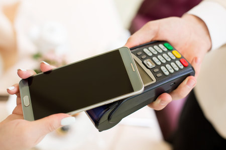 Secure payment technology concept and service charge, customers are using their phone to pay using paywave technology by tapping near the electronic card terminal.