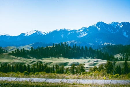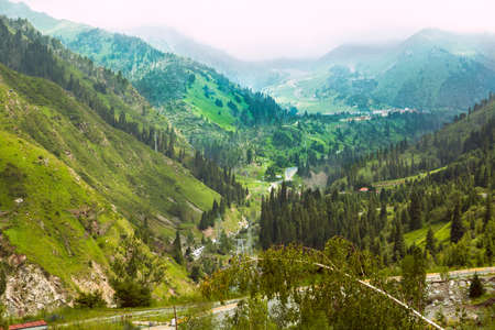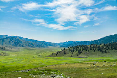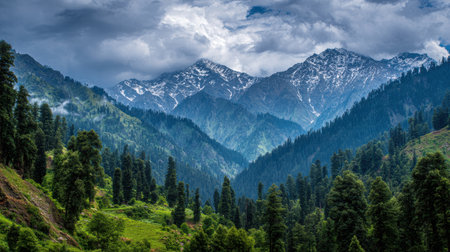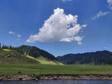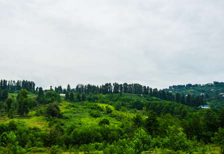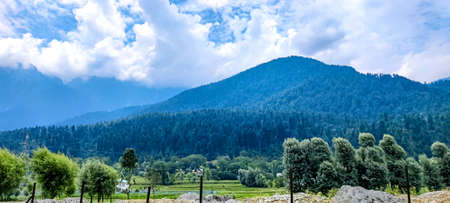 Kashmir beauty green hills forests in mountains. summer landscape with green grass on the hills. nature scenery on a sunny day with clouds on the sky