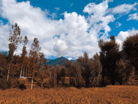Cloudy blue sky over autumn field golden cyan and magenta. The beauty of landscape nature huge beautiful hills and long green trees around the crop field.