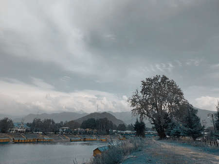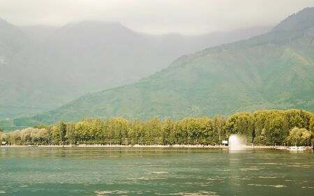 A view of botanical garden with lake in winter season, and the beautiful mountain range in the background in the city of Srinagar, Kashmir, India