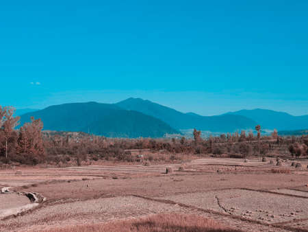 The beauty of landscape nature huge beautiful hills and long green trees around the crop field in magenta and cyan colors.