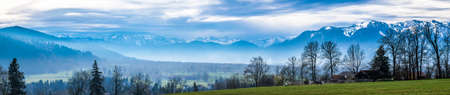 Panoramic view of beautiful mountain landscape small village among snow pine trees mountain background