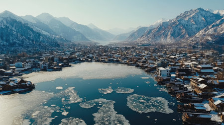 Golden hour over Dal Lake in winter, as the setting sun casts a warm glow on the icy water and the majestic snow-capped mountains in the background.