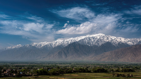 The image showcases a picturesque landscape featuring snow-capped mountains in the backdrop and architectural structures in the foreground. The composition captures a clear, bright sky with wispy clouds. It may be suitable for various commercial purposes such as travel brochures, landscape design, or environmental projects, as well as editorial content.