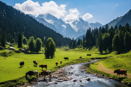 Explore a stunning mountain landscape featuring snow-capped peaks, lush greenery, a flowing river, and a peaceful atmosphere perfect for nature lovers and adventure seekers.