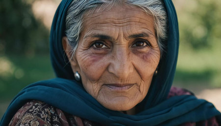 A mature Tajik woman 75 years old, gazes directly showcasing intricate traditional attire, rich cultural heritage of her nationality, evoking wisdom and grace. Brunette woman, wearing a headscarf. AI